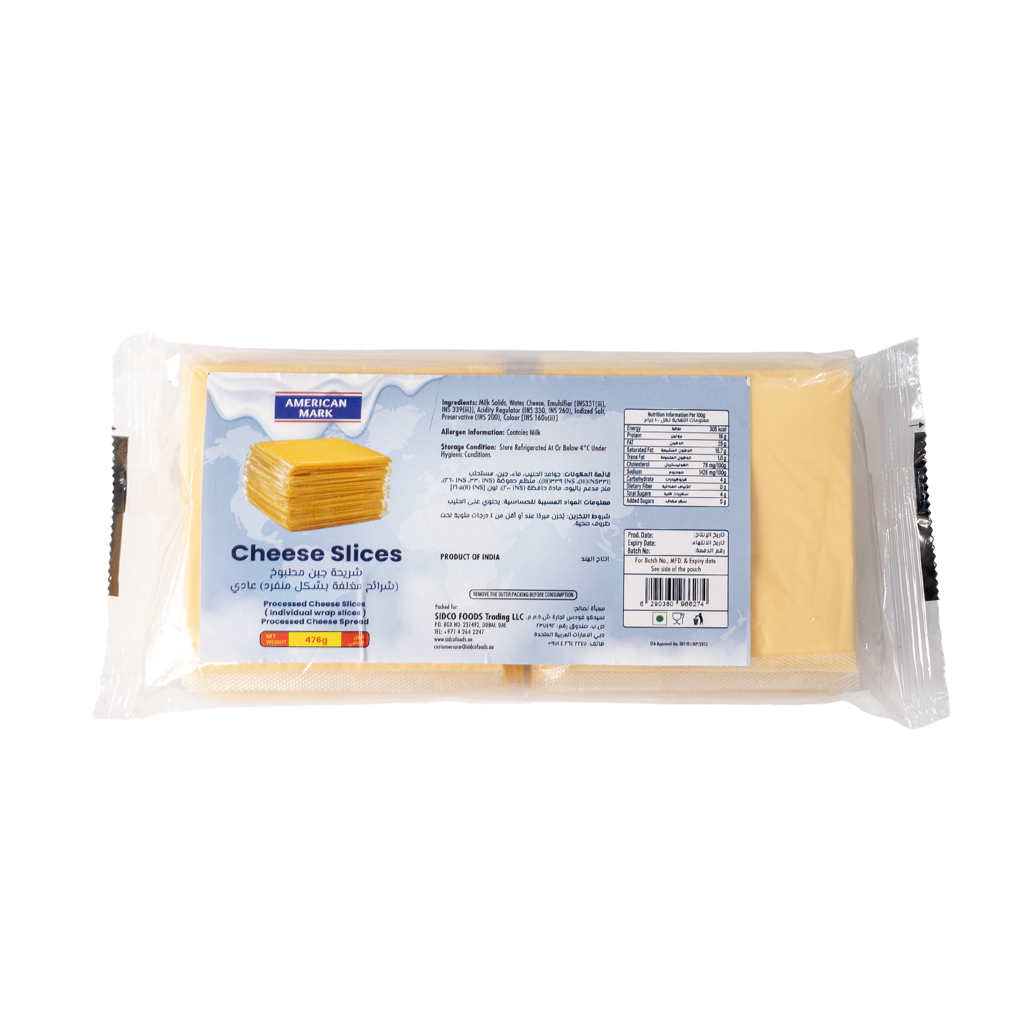 • Smooth and creamy American Mark Cheese Slices, perfect for sandwiches and burgers.