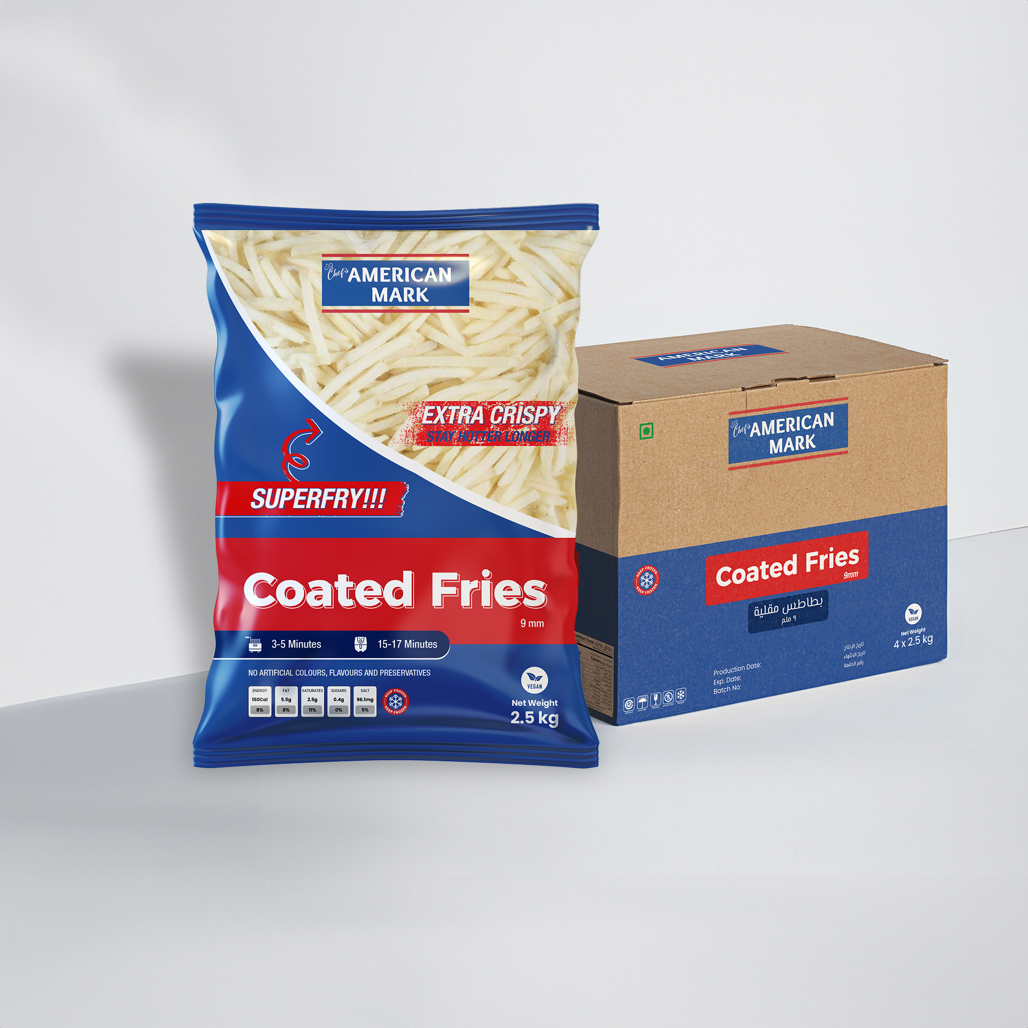 American Mark Coated Fries are premium-quality, golden fries with a crispy coated exterior and soft, fluffy interior, delivering the perfect texture for professional kitchens. Cut to 9 mm thickness, these fries are ideal for restaurants, hotels, fast food outlets, and catering services that demand consistent quality and taste.