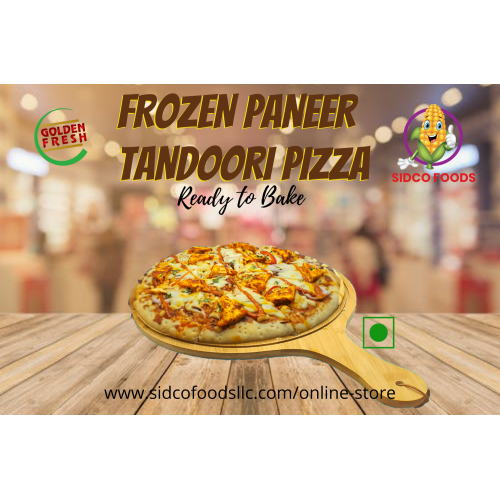 Frozen Paneer Tandoori Pizza .A thick and crispy pizza base topped with tomato sauce, mozzarella and mature Cheddar cheeses, red onion, pesto oil and Paneer topped with juicy grilled tandoor masala.