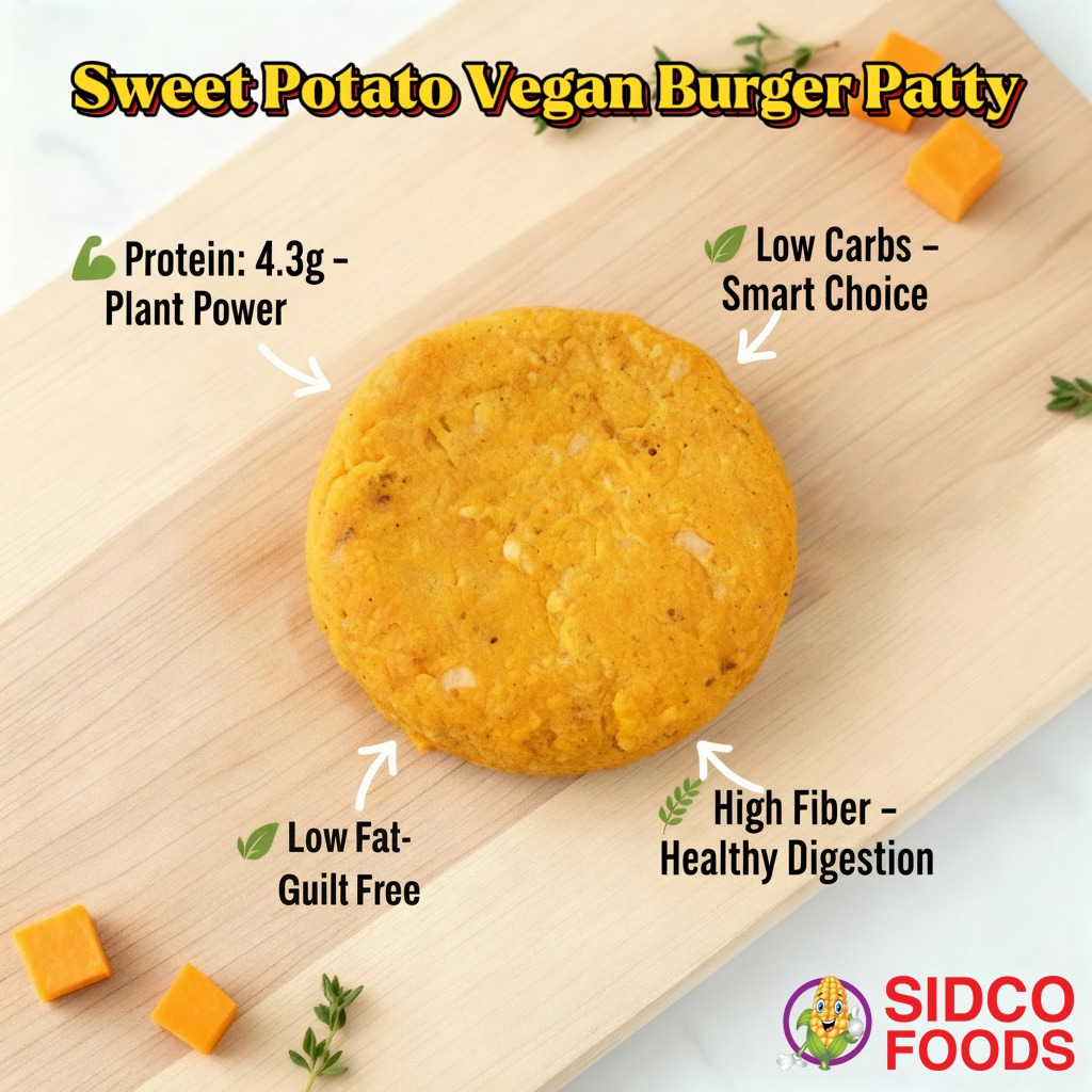 Discover the wholesome goodness of our Sweet Potato Vegan Burger, a nutritious and delicious choice for anyone looking for a plant-based meal. Crafted from premium-quality sweet potatoes blended with fresh vegetables, herbs, and spices, this burger patty delivers a satisfying balance of natural sweetness and savory flavor. The golden, crispy exterior pairs perfectly with its soft and hearty inside, making it a versatile option for both vegans and non-vegans alike.